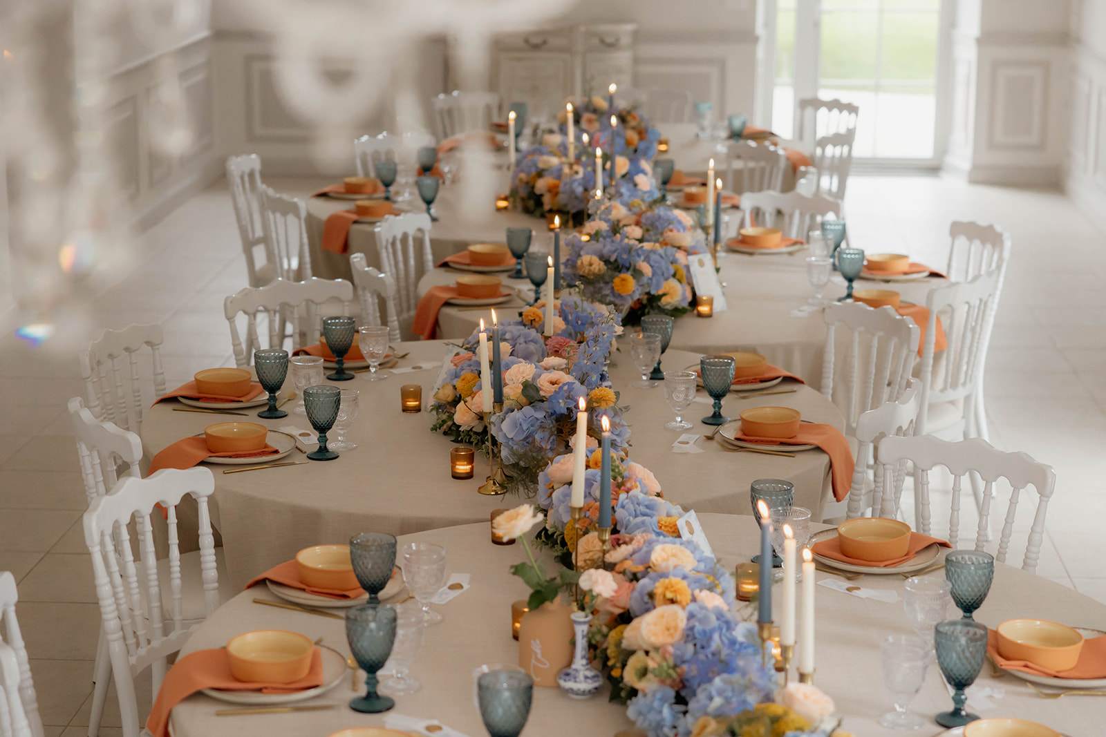 Le décor joue sur les contrastes: la douceur du lin, la chaleur des notes orangées et la fraîcheur des fleurs bleutées créent une harmonie raffinée. Chaque détail, des dorures subtiles aux verreries colorées, a été pensé pour sublimer la grandeur du lieu sans la surcharger.