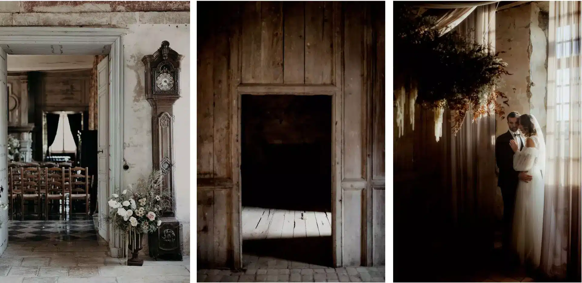 – Un château ou une vieille demeure plein de charme : pour un côté cocooning voire poétique, optez pour une bâtisse ancienne avec du caractère comme pour le mariage minimaliste de Kim et Piers ou ce shooting hivernal.