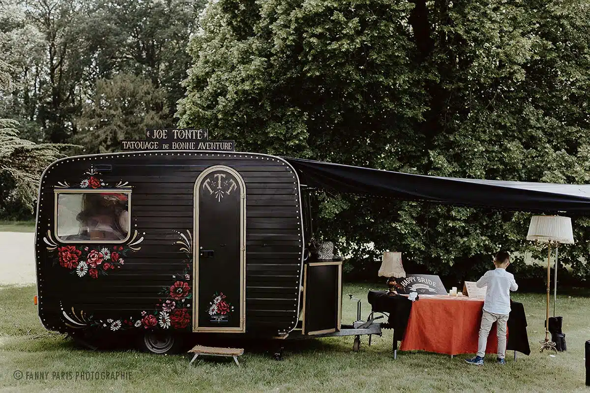De sa patte fine et poétique, Joe Tonté réalise des tatouages en caravane: vrais tatouages à l’intérieur et bar à tattoos temporaires sous le auvent extérieur. La caravane, nommée Esperanza, est aussi un élément de décoration à part entière. Une sacrée touche bohème, gipsy, rock’n roll !