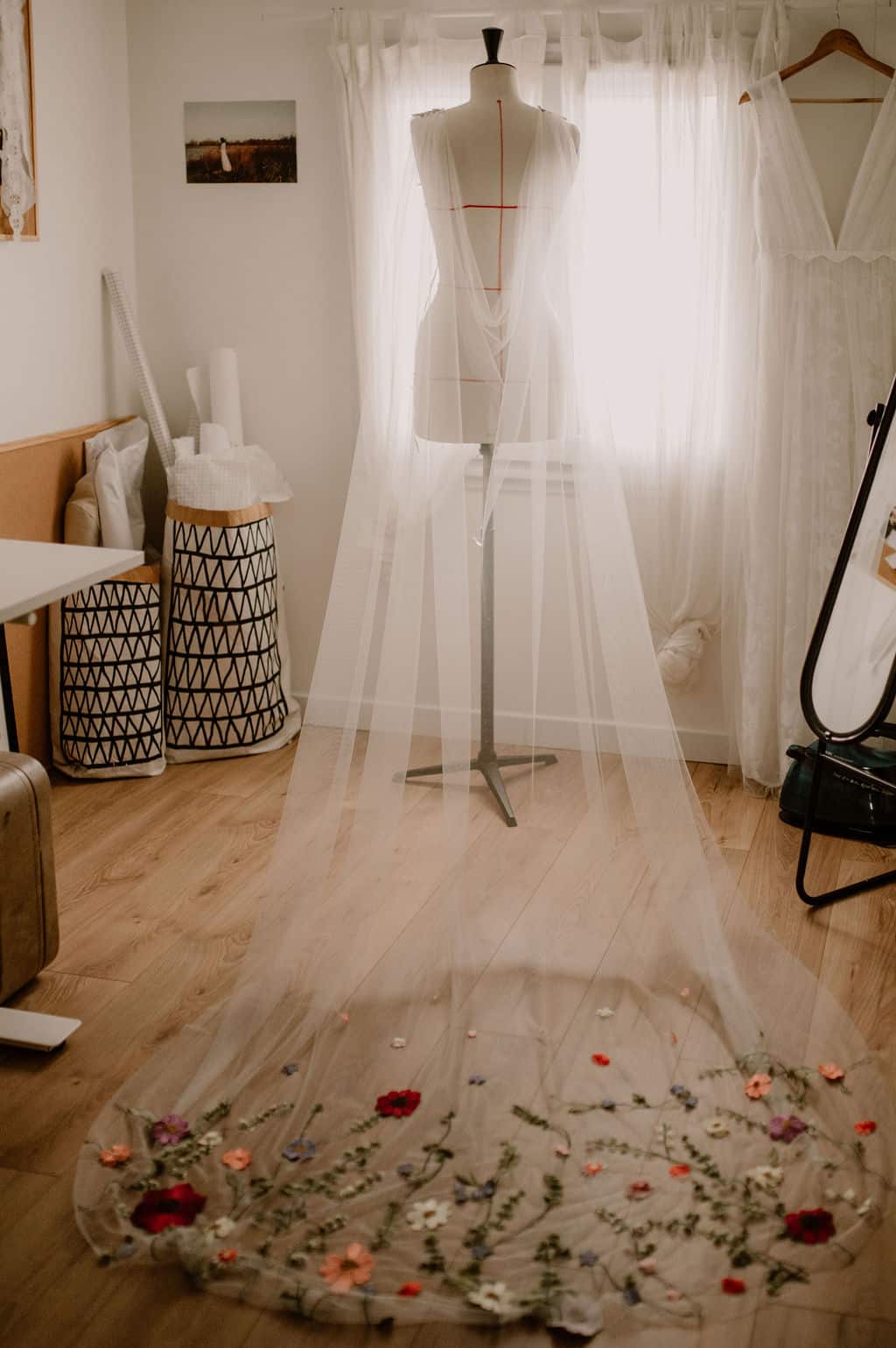 Le petit plus de la maison : Maud propose à ses mariées de personnaliser un peu plus leur création en y ajoutant une broche en fleurs séchées et stabilisées amovible, souvenir qu’elles garderont de ce joli jour.