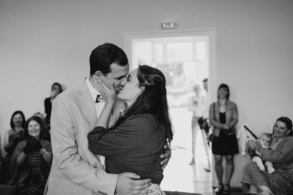 – et notre maîtresse de cérémonie, Clémence, a été formidable ! C’était drôle et émouvant à la fois. Tout en restant un peu pudique car nous ne sommes pas super à l’aise avec les démonstrations d’affection débordantes en public. Clémence a réussi à orchestrer une cérémonie vraiment plus-que-parfaite et ça reste notre meilleur souvenir avec l’échange de nos vœux et de nos alliances (faites sur-mesure par une bijoutière quimperoise indépendante, Janig Cloarec, avec une petite feuille de chêne sur chacune ! Janig Cloarec a arrêté son activité mais, nous sommes très fiers de son travail super personnalisé.)