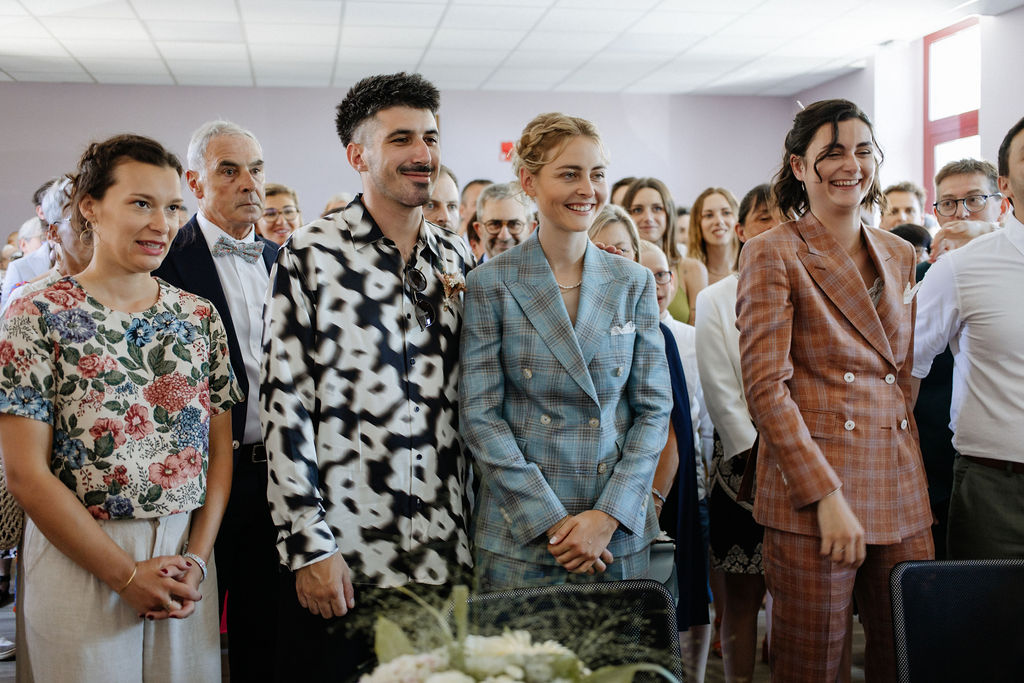 Photographe : Camille PLDS | Robe de Marine : Mademoiselle de Guise | Robe de Carla : Camille Marguet | Tailleurs sur mesure de Marine et Carla : Tailor Trucks | Fleuriste et décoratrice : Un Brin Nomade | Décoratrices (plan de table - panneaux) : Blanc de Paon et Ker Ostara | Décorateur : La Tablerie | Traiteur : Maison Le Metayer | Alliances : Angèle Brousse et Le Gramme |