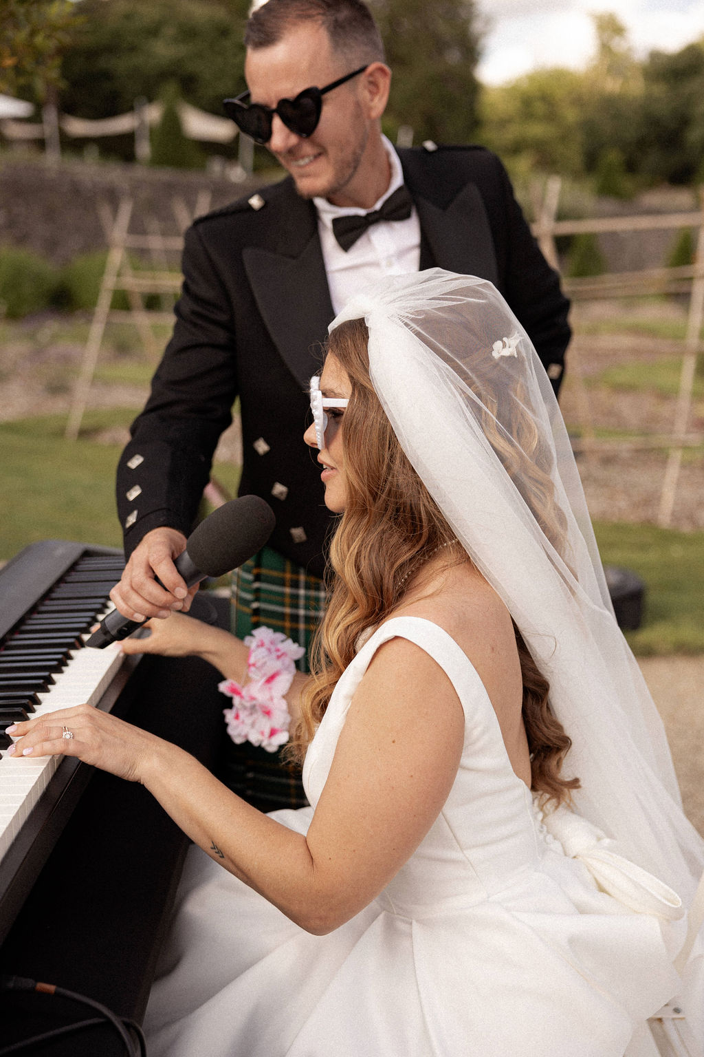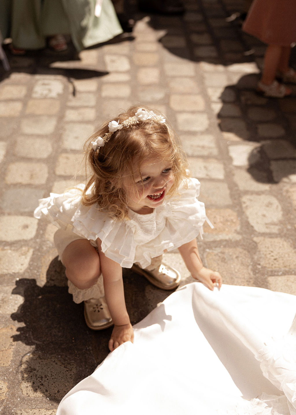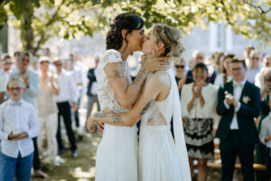 Tout le mariage a été très chargé d’émotions, mais si je devais retenir deux instants en particulier, ce serait d’abord la cérémonie personnalisée, quand Mathilde a prononcé ses vœux à Nathanaël en jouant du piano. C’était à la fois intime, sincère et bouleversant. Et puis le moment de leur découverte à l’église… un de ces instants suspendus où tout le reste disparaît.
