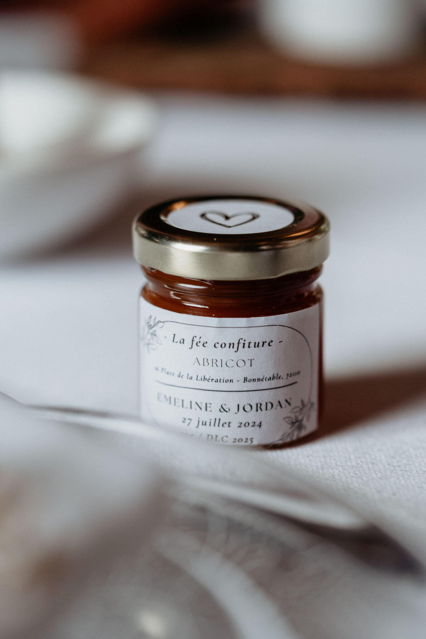 Une très grande partie de la décoration venait de chez nous (confiturier, dame Jeanne, urne…) et sont des objets réemployés, chinés… Nous avons loué du mobilier : le canapé et deux chevalets de Nina de chez Oh les coeurs, la vaisselle vintage de la Vaisselle de Charlotte.